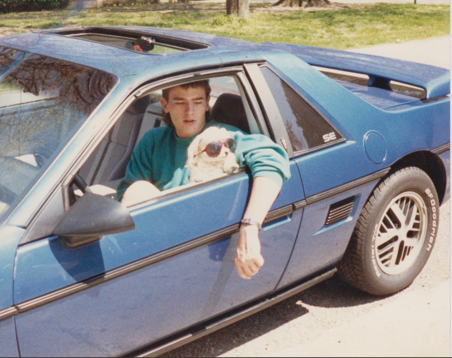 Woodstock, 1969 I humbly submit a photo from circa 1987 for your approval. A photo of me, my dog wearing sunglasses, and my 1984 Fiero SE.