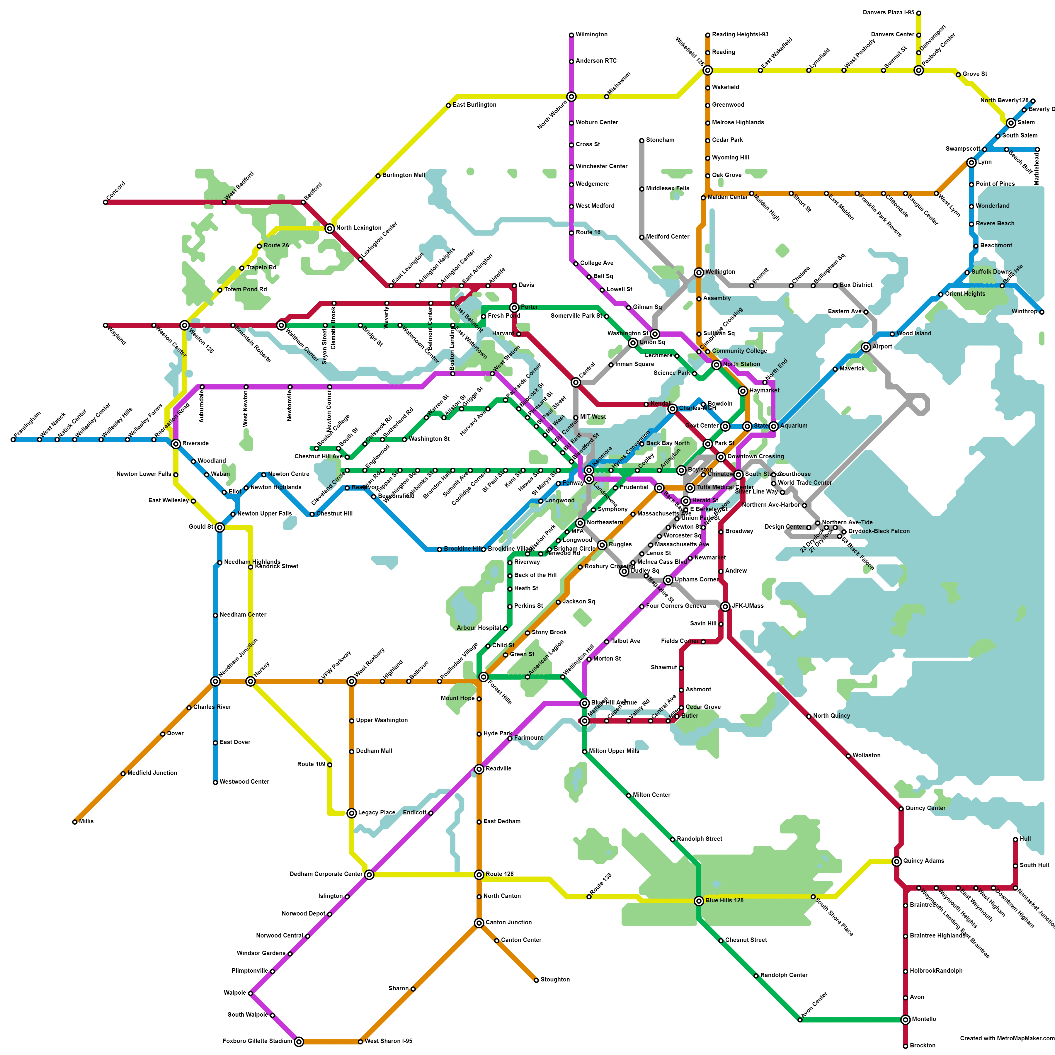 Interesting map. Orange line to Gillette stadium is wild lol. I would move Cambridge Crossing on the purple line east as Lechmere and Comm. College are already pretty close together and the part of Charlestown near the Mystic and Boston harbor is kind of a transit desert