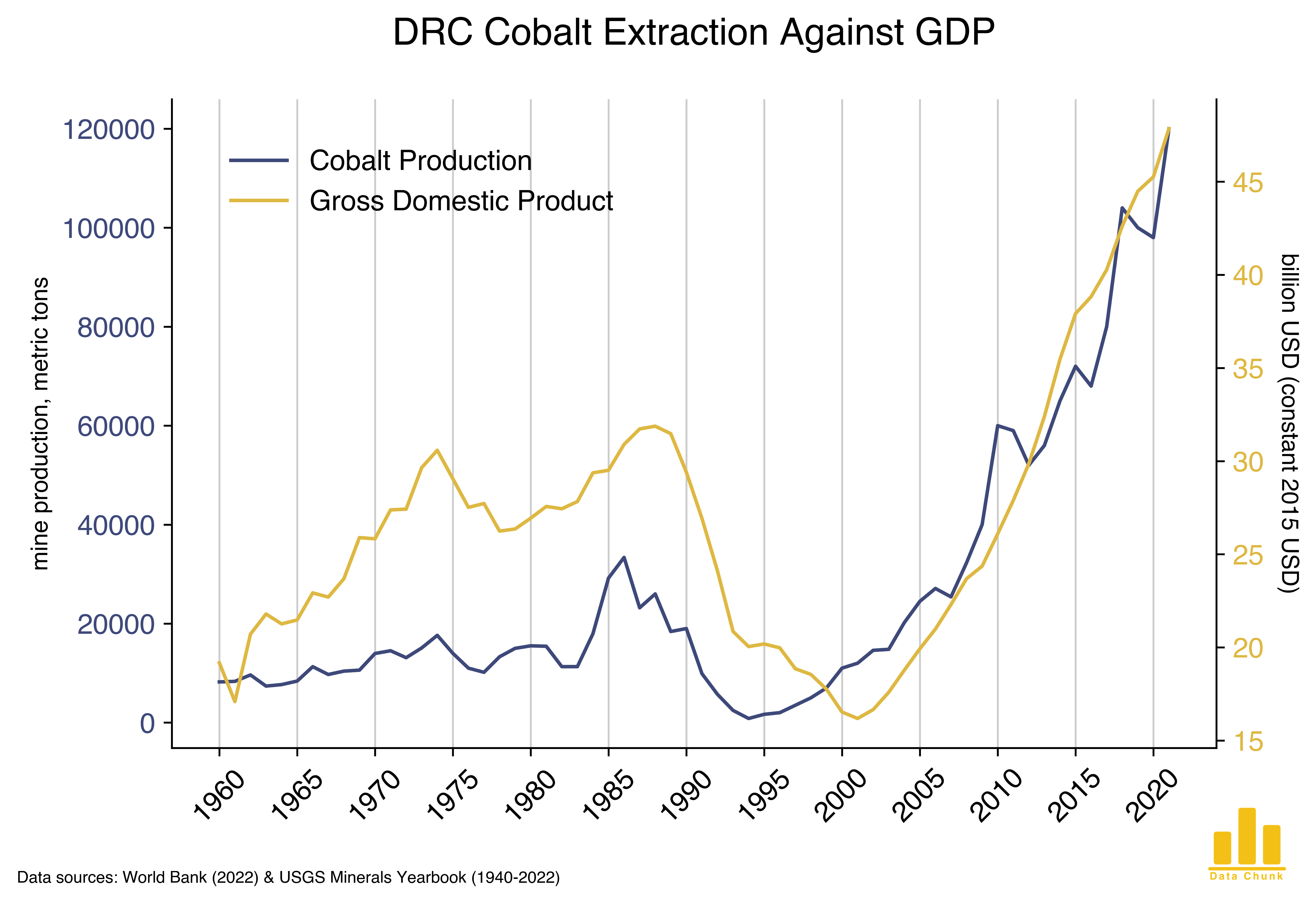 Data on GDP was collected from the World Bank and cobalt extraction data from the USGS Minerals yearbook. Tools used: python, seaborn.