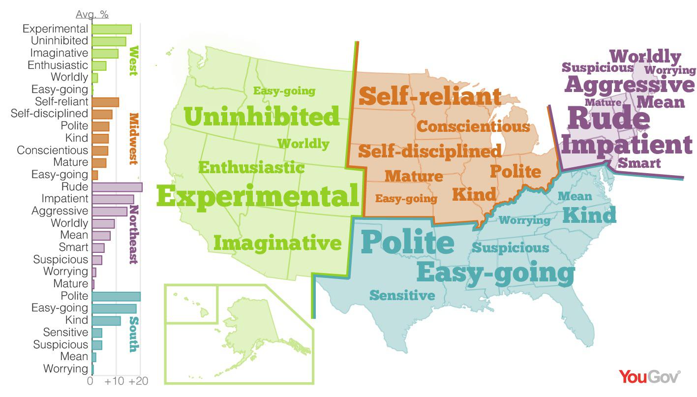 Oh, yeah, I definitely associate Utah and Montana with people who are uninhibited and experimental, and "polite" and "kind" are the first words that come to mind for Mississippi and Alabama.
