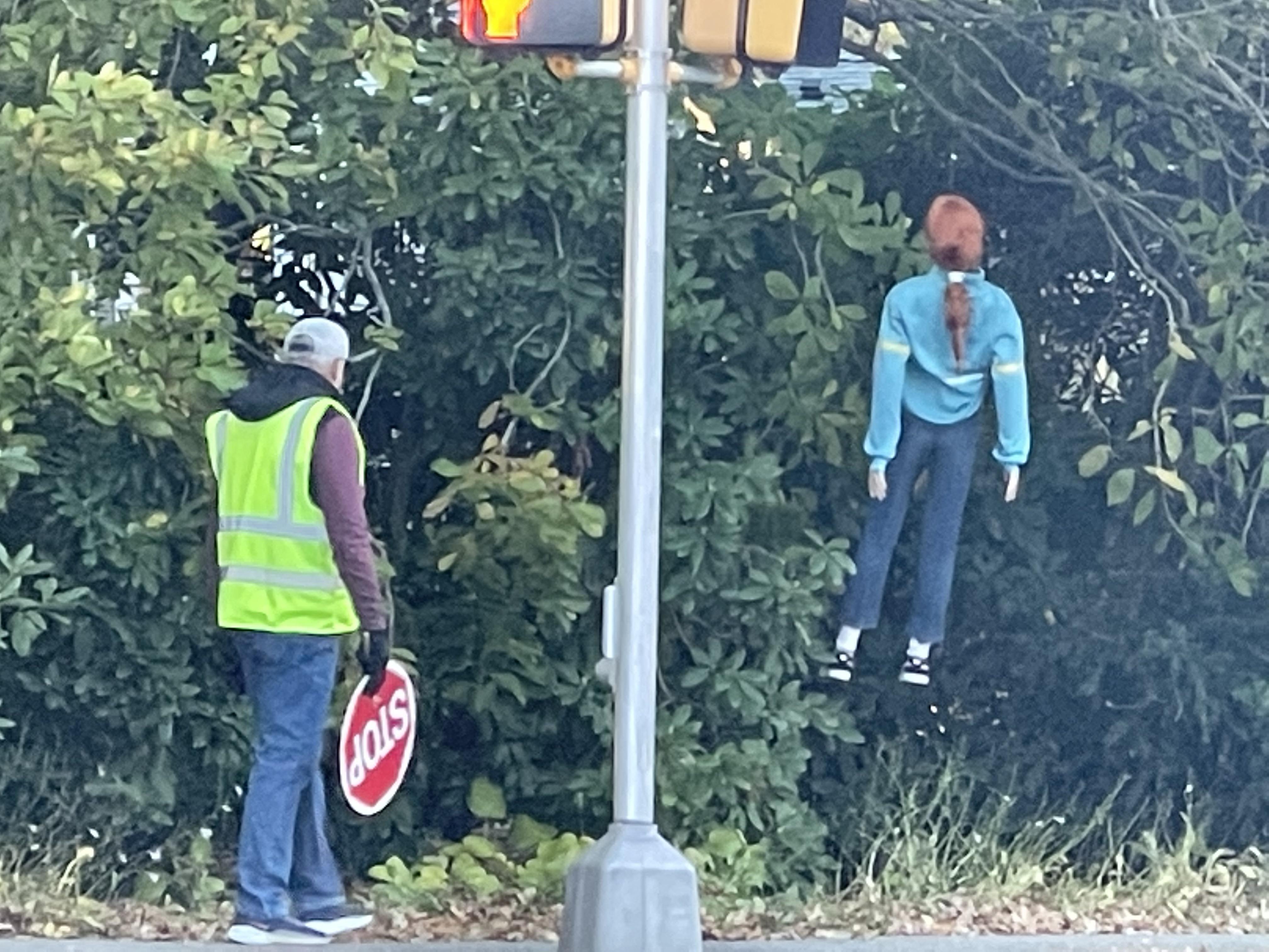 Crossing guard disturbed by Halloween decoration at his post in Marblehead.