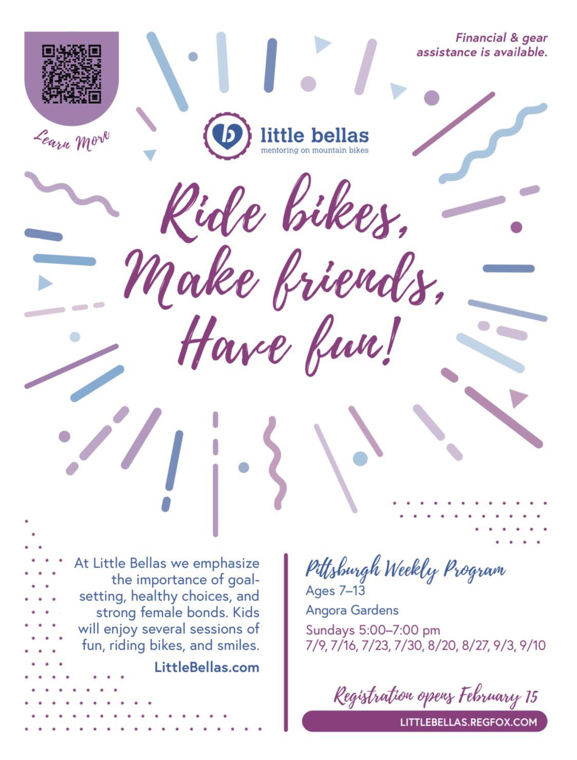 Sure! Little Bellas is a national non-profit organization whose goal is to get more girls on bikes. It is not a skills clinic. It’s a mentoring program which means we have female mentors who ride bikes and play games to get the girls having fun, making friends, and feeling confident riding their bikes. The games we play help with bike skills! A program day consists of a bike ride, a snack that we provide because food is fuel, and playing games. With registration you get a jersey and a swag bag! Little Bellas works hard to make this program accessible to all. Anyone who cannot afford the full fee can pay what they can. There is also gear available to rent like bikes and helmets. It’s a really great organization and a really fun activity for young girls. Being able to mountain bike is a fantastic skill to have!