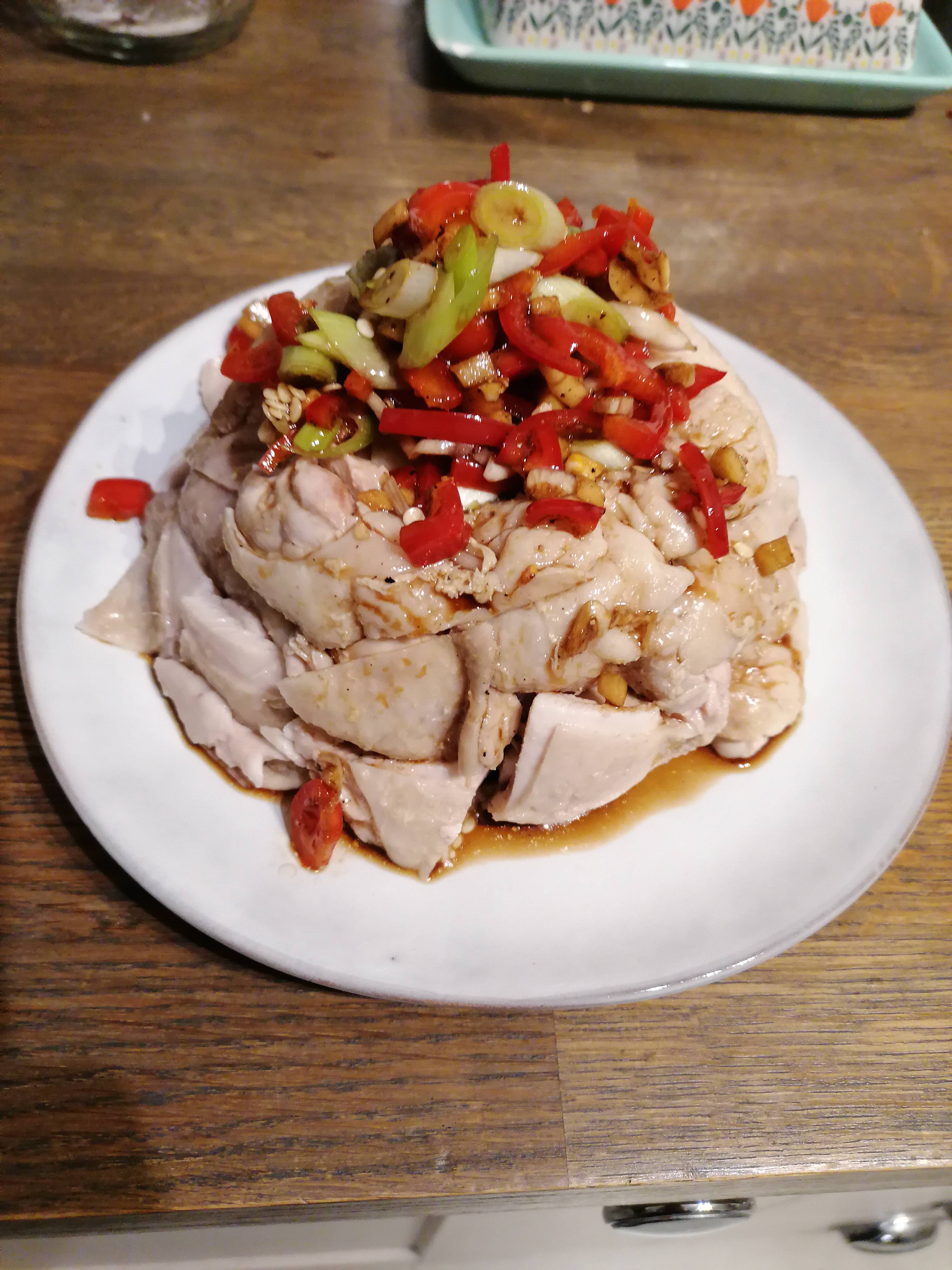 Overturn your bowl of poached chicken on to a plate and top with the spring onion oil mixture.