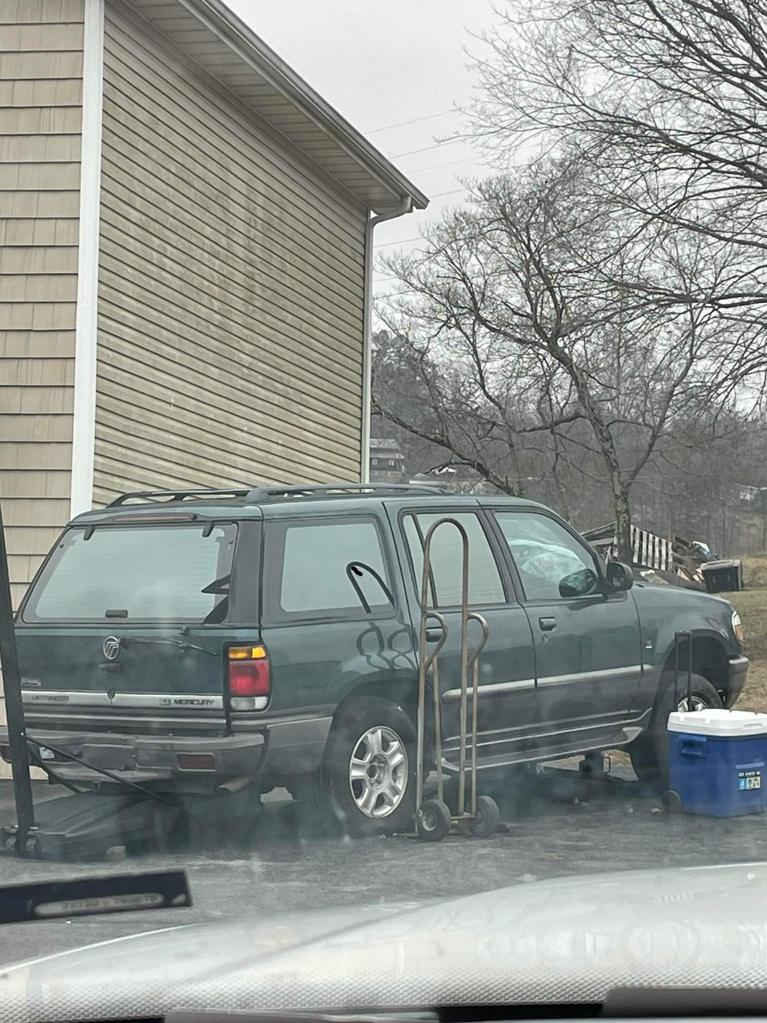 The shadow, of course. I believe he edited it before sending it to make sure I noticed. At first, I was looking for someone to be under it, and it up on the bottle jack.