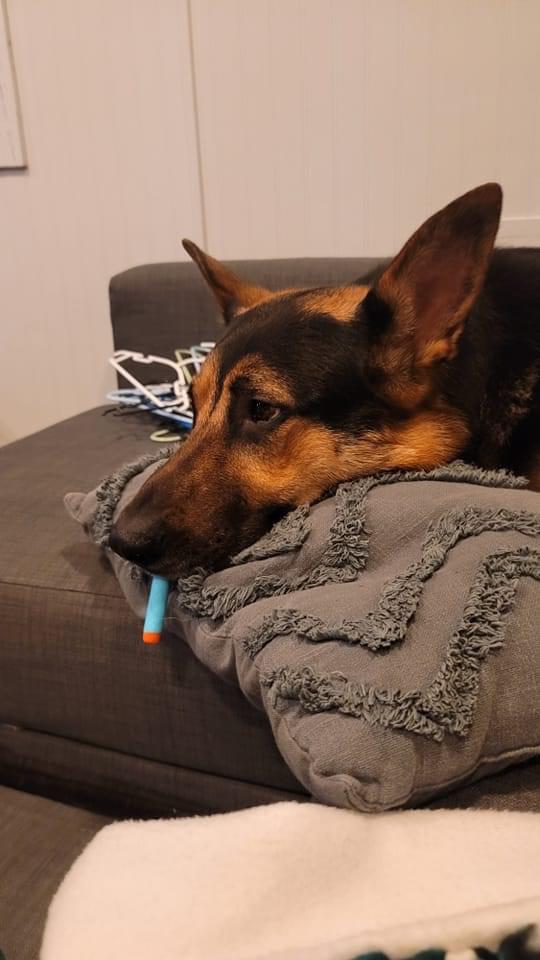 PsBattle: this dog chewing a nerf dart.