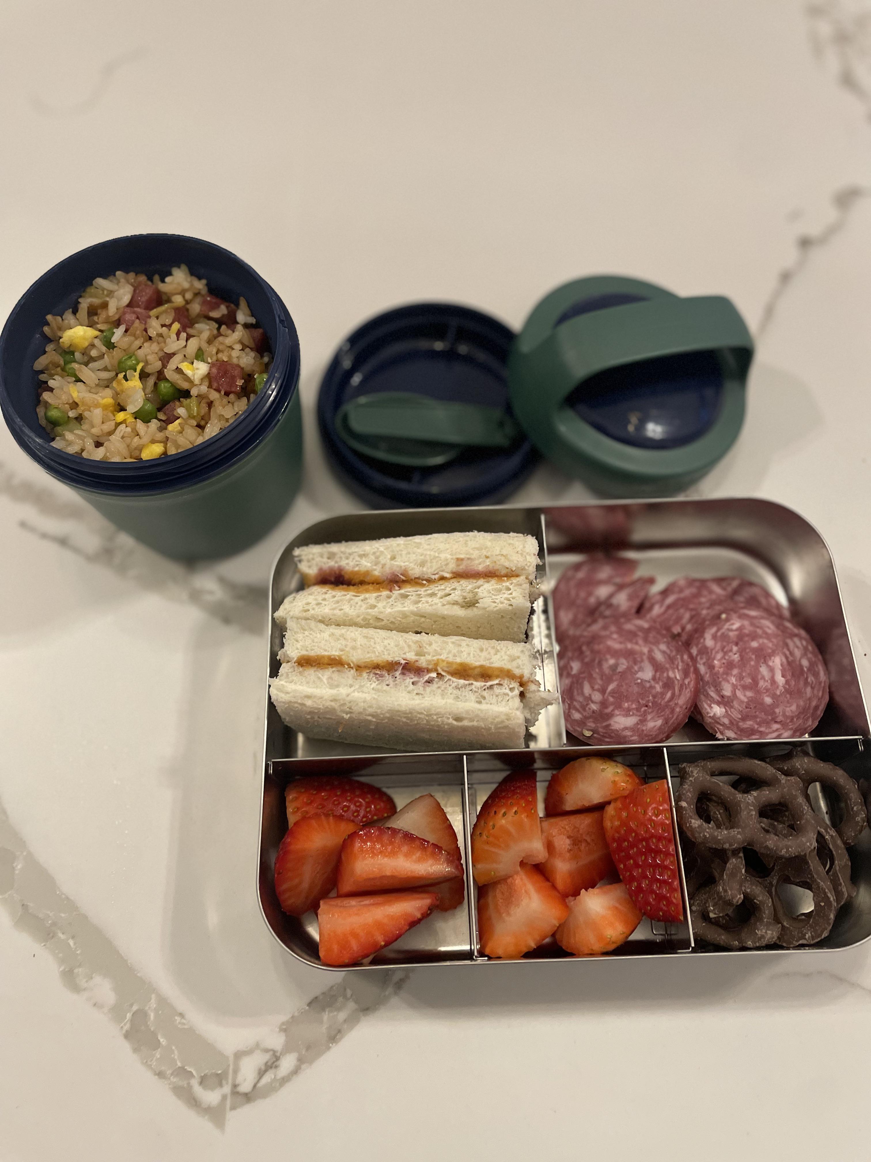 [Homemade] My Kindergarteners lunch - fried rice, pbj, strawberries, sausage, chocolate covered pretzels Submitted by cowskeeper t3_10p5nvl on January 30, 2023 at 3:31 PM in food No comments 3