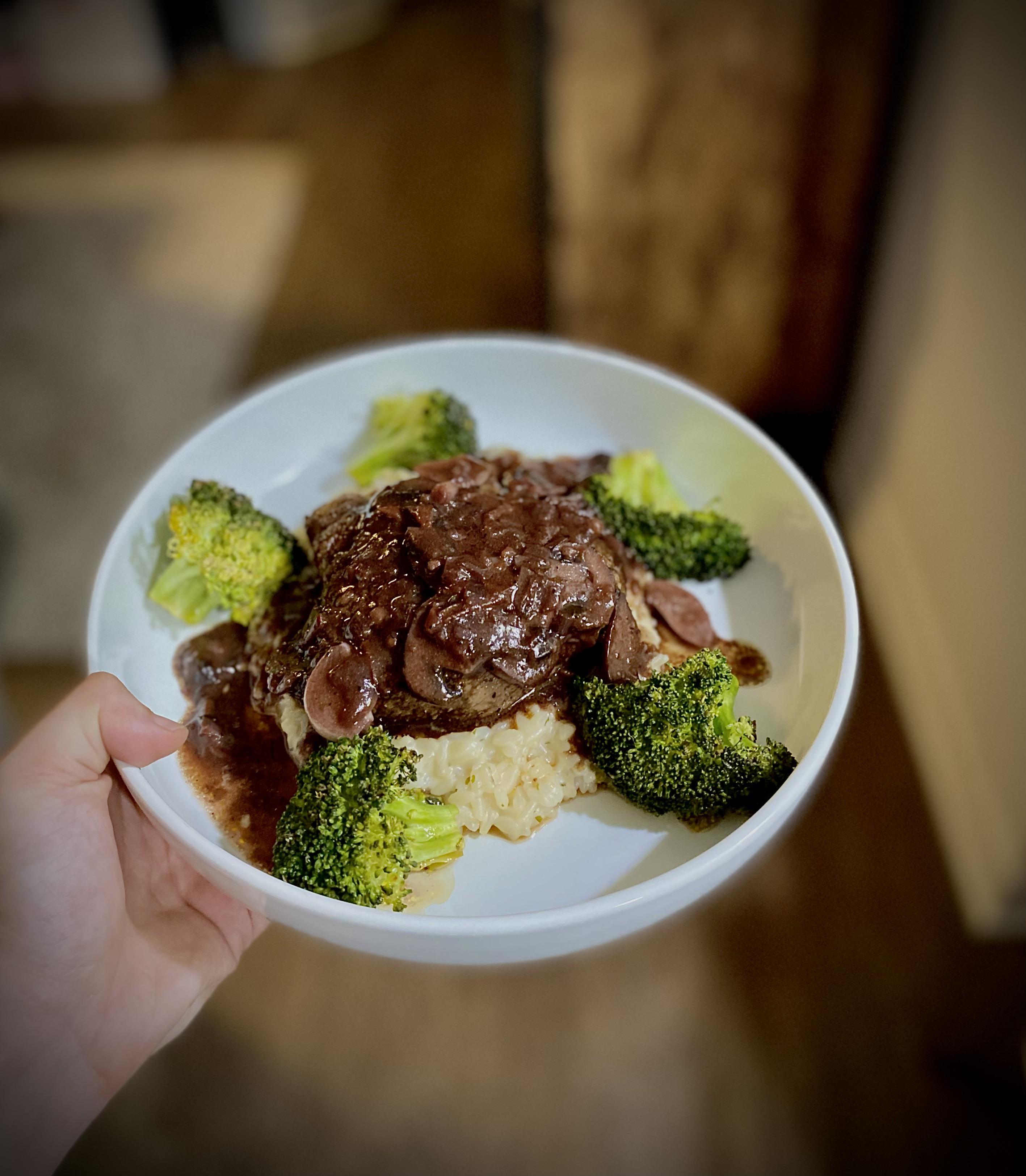 [homemade] filet with a red wine mushroom gravy, four cheese risotto, and broccoli